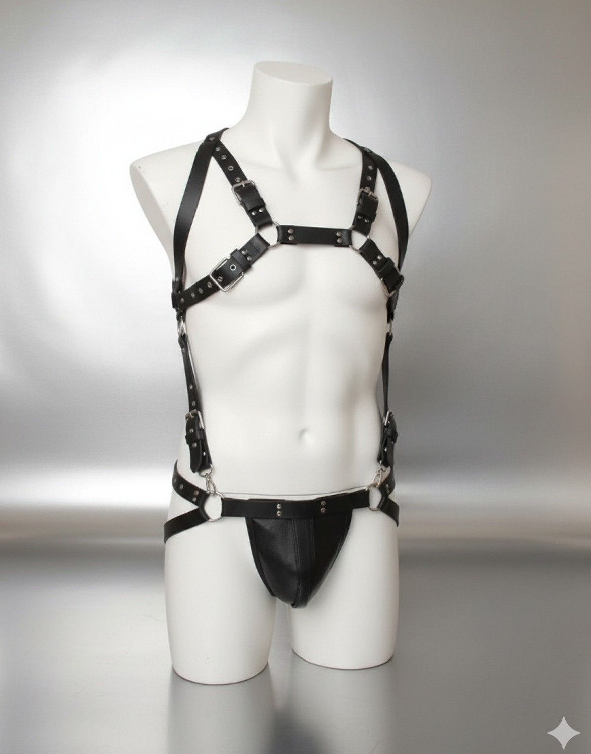 A leather harness is a piece of equipment typically made from genuine leather.It consists of an arrangement of straps and buckles designed to fit around a body, often for purposes of restraint, support, or decoration.