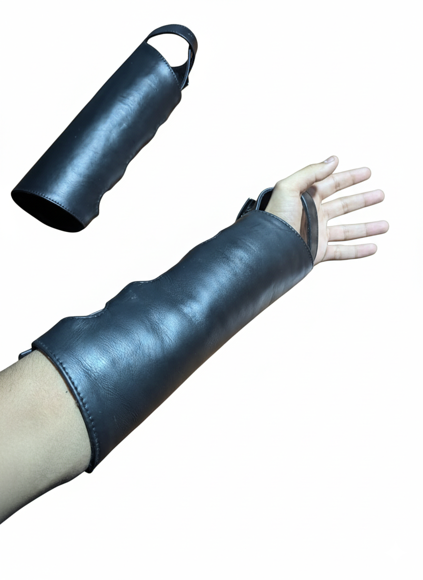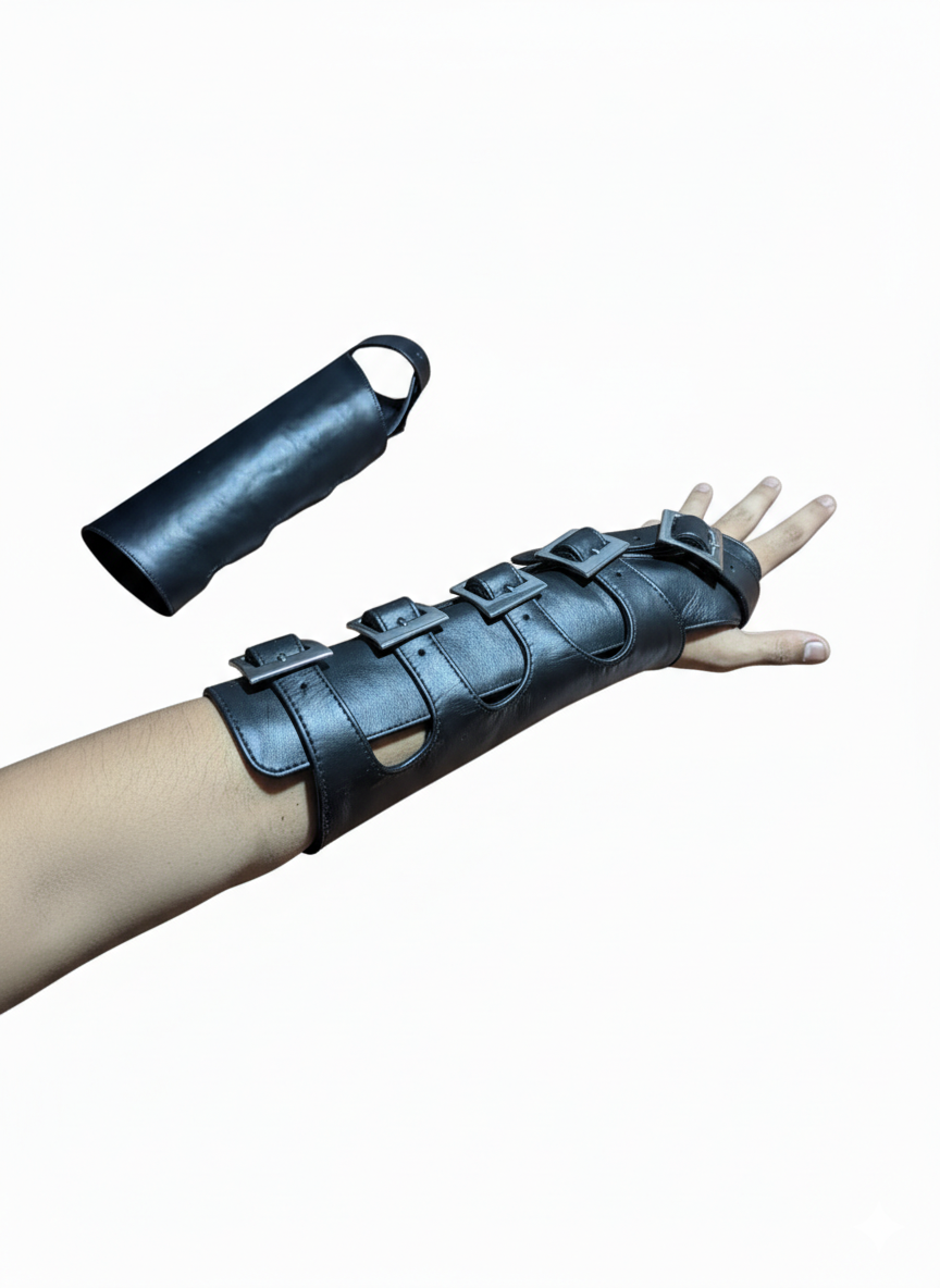 - Description: This specific item is a black, faux leather arm cuff featuring multiple adjustable straps with buckles for a secure and comfortable fit.